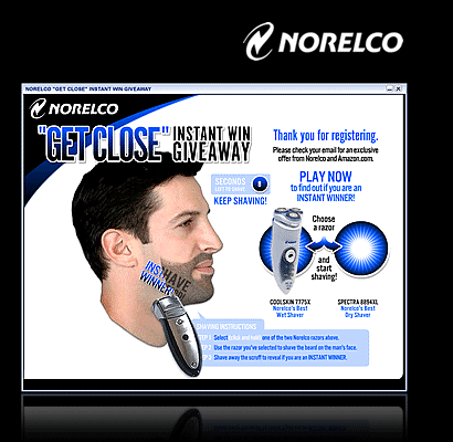 Concept, design and development of for a Norelco online promotion and ad campaign. The campign was a huge success receiving more than 20,000 hits in the first week it ran. The sweepstakes has ended but click here for a demo version of the game. |
